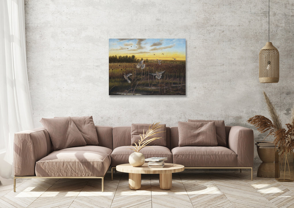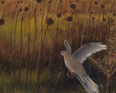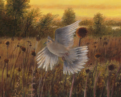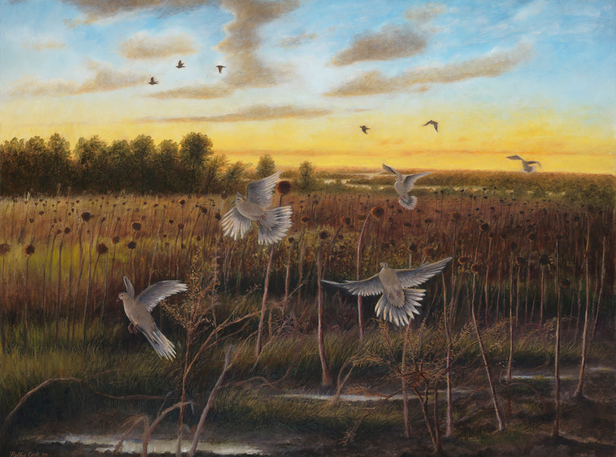 "Doves Descend Upon Sunflowers" was completed in 2009. I really enjoy capturing the golden colors of the afternoon. I focused on the transition of yellows to blues in the background to illustrate the distance in the horizon. This presented the opportunity to show the gracefulness of the doves as they ascended upon the sunflower field. Painting is in excellent condition and the colors are rich and vibrant. This painting would be a great focal piece in a home.