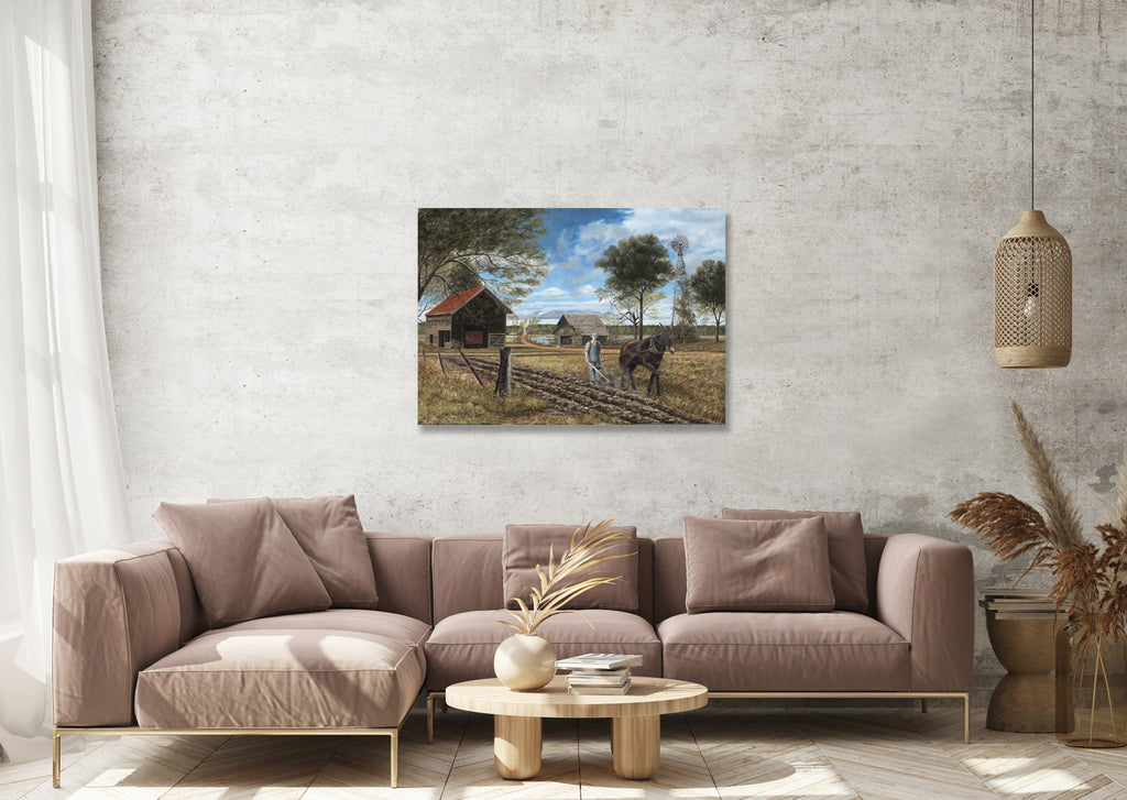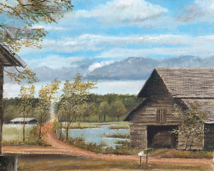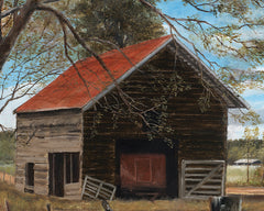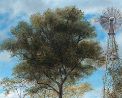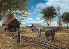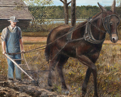 Early Years of Agriculture was completed in May 2009. In this painting I wanted to paint a scene that might have taken place on the farm before the arrival of modern technology such as the tractor. The farmer relies upon the mule to provide the necessary horse power to till the land. The old barns worn appearance represent the many years they have served as shelter for livestock, supplies and farm tools. The windmill provides the water resource that is a vital part of the farms existence.