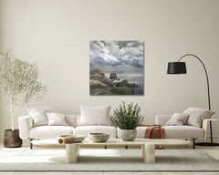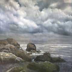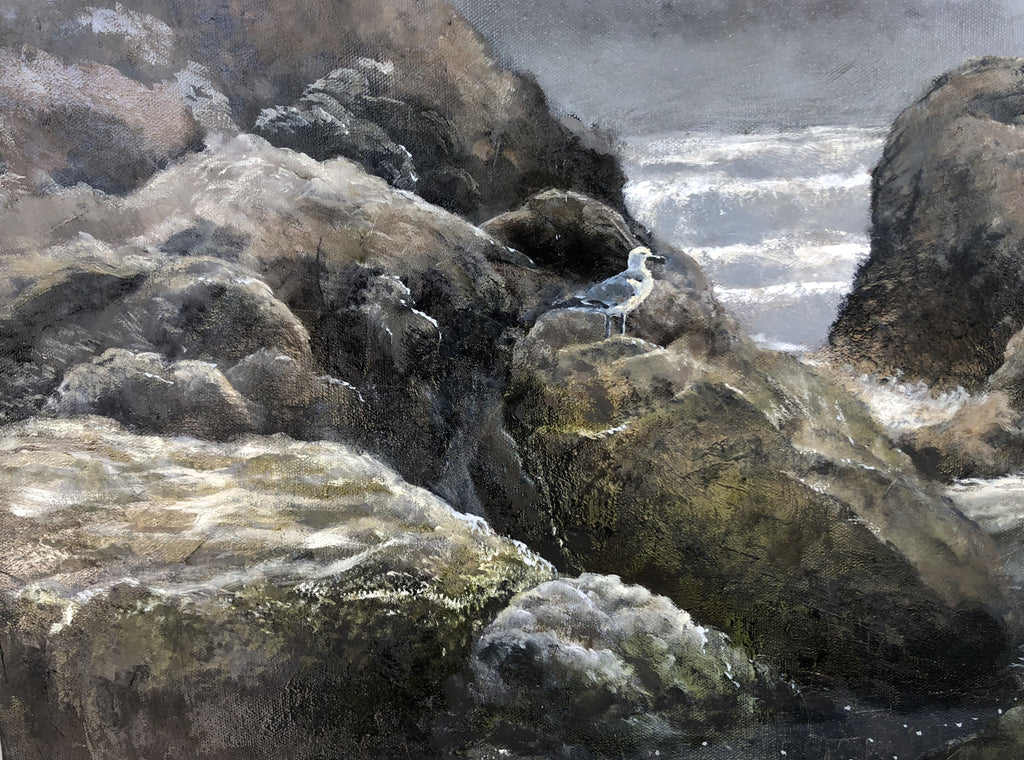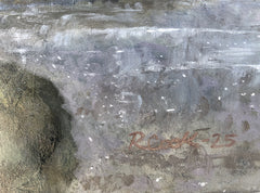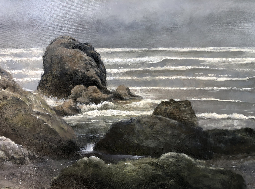 This painting was completed after summer trip in 2024 to the misty coastline named Ruby Beach. Located in Washington’s Olympic National Park, embodies the signature traditional style, emphasizing the interplay of light, texture, and serene natural beauty. Ruby Beach, known for its rugged coastline, sea stacks, and driftwood-strewn shores, provides a dramatic subject for this painting. This work depicts a rocky out cropping from the Pacific Ocean, their silhouettes softened by the misty coastal atmosphere. The painting captures the early morning light, with warm hues of silver reflecting off the waves, contrasting with the cool, shadowed tones of the rocky cliffs.