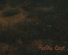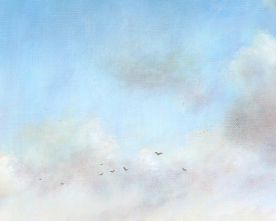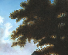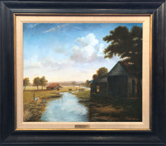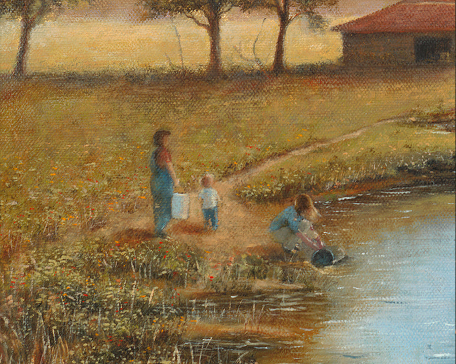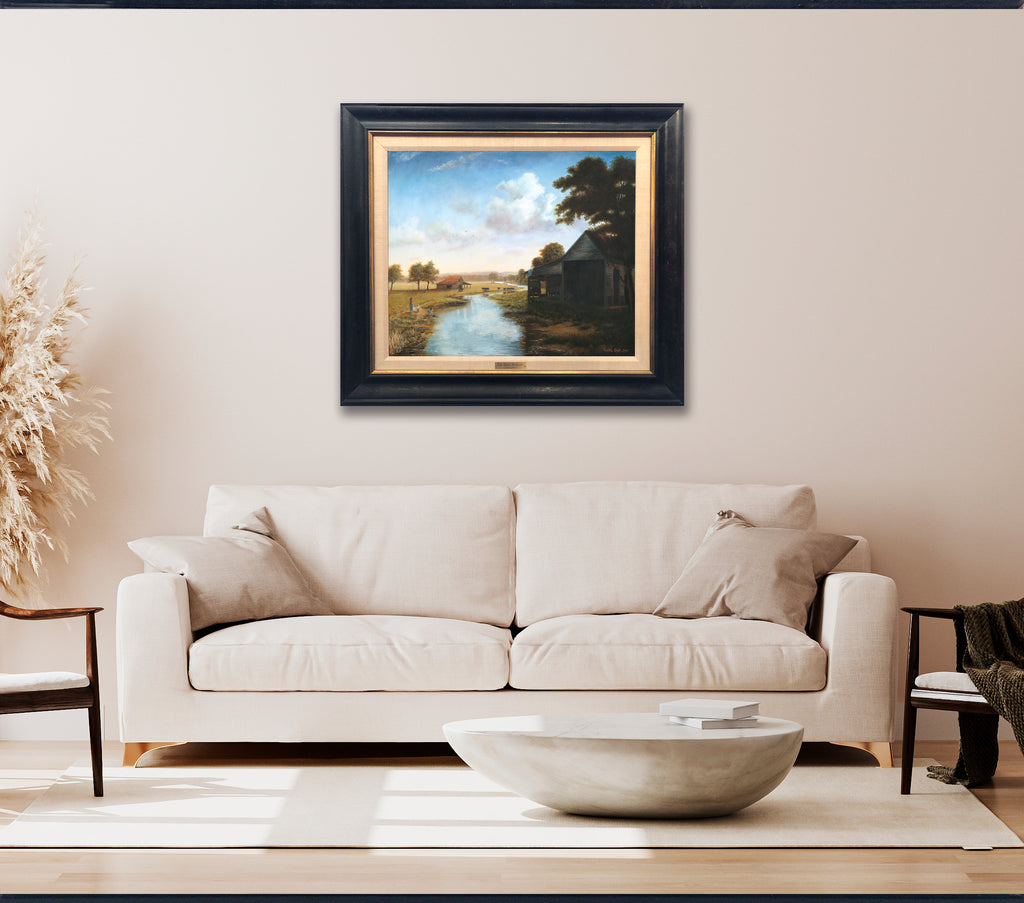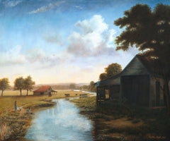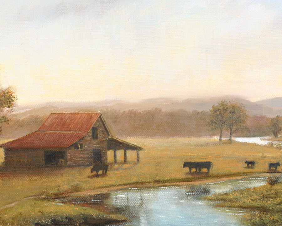 The Water Gathers is a painting that has long distance views of the country side. The creek flows through the farm and recedes into the landscape. An old home abandoned home is in the shadowy foreground by the creekside. The water gathers in the scene are modest in size within the composition as the beauty of the landscape takes center stage.