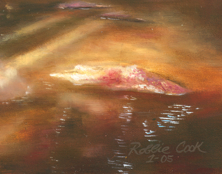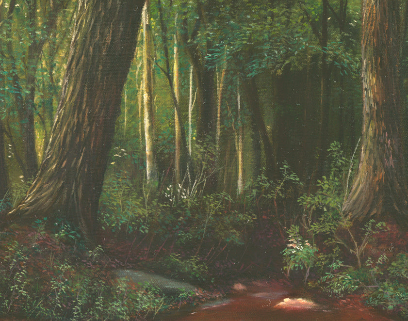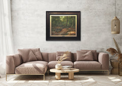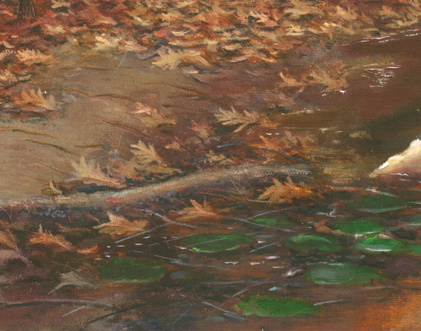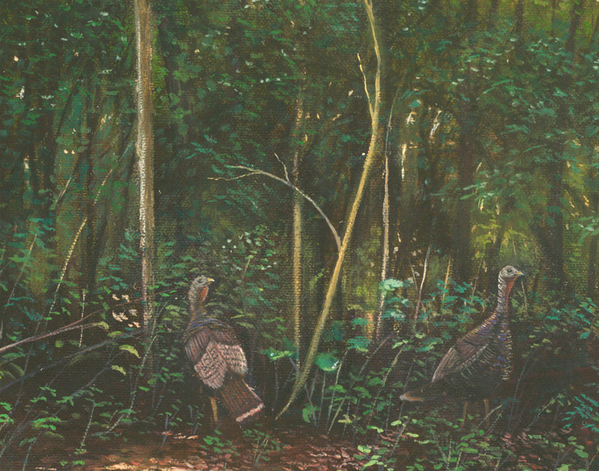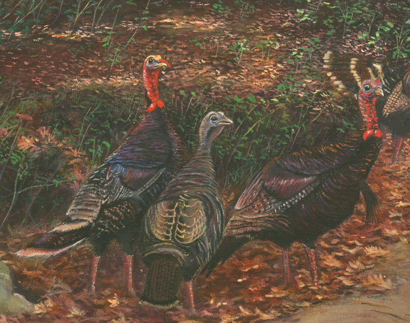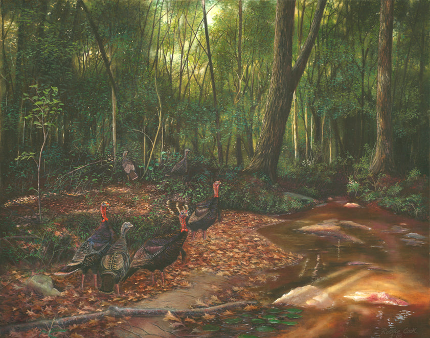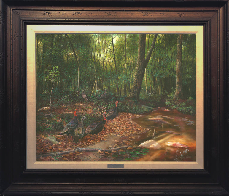 This painting is in excellent condition and is framed. This scene captures wild turkeys in a beautiful lush creek bottom. The shadows of the spring forest reflect in the pooling water as the creek flows. The leaves gather in the calm pool of water as the subtle light reflects off of the surface of the water. The colors in this scene are rich colors you would except to see as you walk through a dense wooded forest.