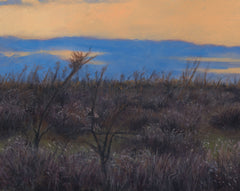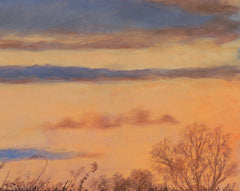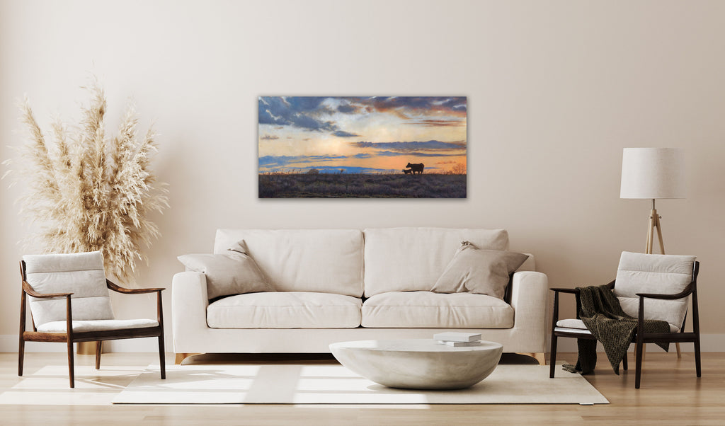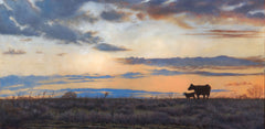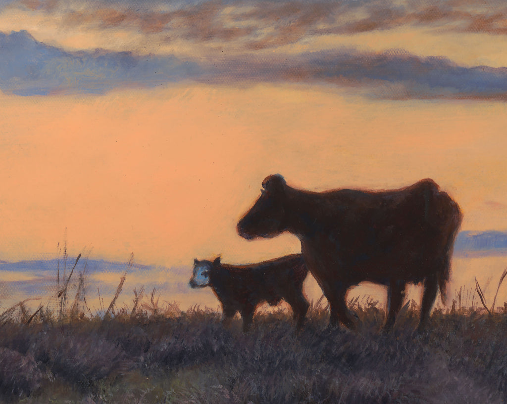 "New Life" ...The afternoon glow saturates the scene with warm colors of gold and yellow. The mother cow brings a new calf into the world in solitude. The scene is silent with nothing more than the gentle wind moving through the brush in the foreground. The luminous colors were carefully painted to capture the suns dwindling light at days end.